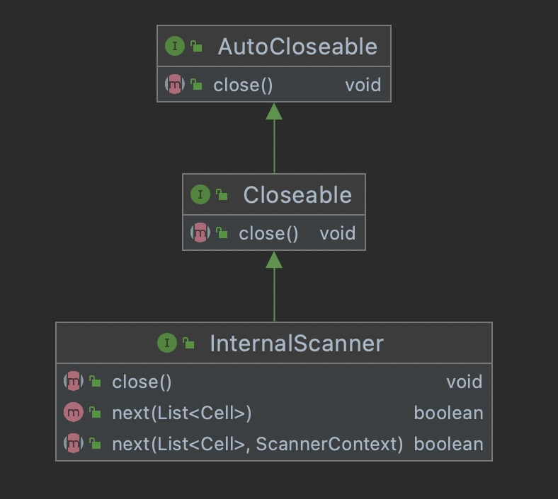 InternalScanner是一个Interface主要提供了两个方法,next(List<Cell> result)方法——获取下一行的数据。而next(List<Cell> result, ScannerContext scannerContext)提供功能相同,只不过允许传入一个ScannerContext用以记录当前scan任务的上下文,判断是否可以提前结束、是否要去读下一列、是否要去读下一行等。并且发生在InternalScanner中的数据比较等操作,都是基于byte[](而不用先转化为RowResults),更加接近于数据在物理上的存储形式,可以获得更高的性能。