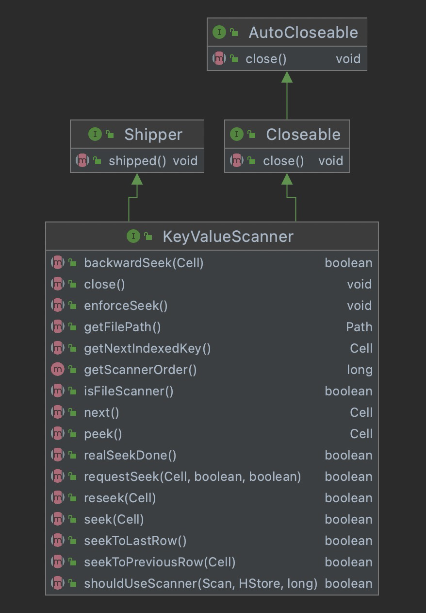 KeyValueScanner也是一个接口,换成CellScanner可能更容易理解。对,它主要提供在一个“可读取的对象上”,获取cell的能力。这里使用“可读取的对象”这个词,主要是因为它可以是一个物理概念上的HFile,但也可以是逻辑意义上有迭代读取能力的scanner。