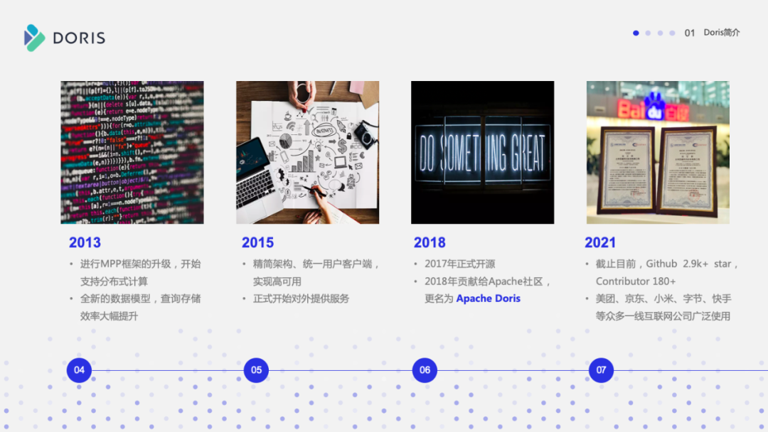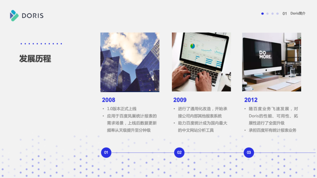 Doris 的历史是从 2008 年开始的,最早是应用于百度凤巢统计报表的场景。在 2009 年我们对它进行了通用化改造,开始承接百度内部的其他报表业务。在 2012 年我们对 Doris 的性能、可用性以及扩展性进行了全面的升级,基本上承担起百度内部的所有统计报表的业务。