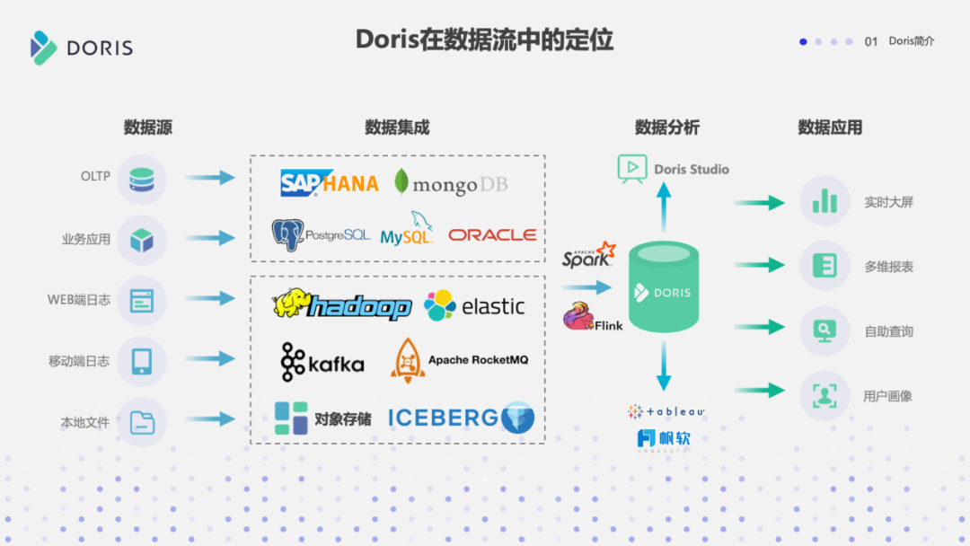 接下来这张图是 Doris 在整个数据分析场景当中的定位。Doris 它本身承担的是一个数据分析的角色,从传统的数据源,包括 RDMS、业务应用,包括一些 WEB 端、移动端的日志,通过 Spark、Flink 等批计算或流计算引擎将数据快速接入到 Doris 当中,并对外向各类数据应用赋能、提供数据分析的服务。