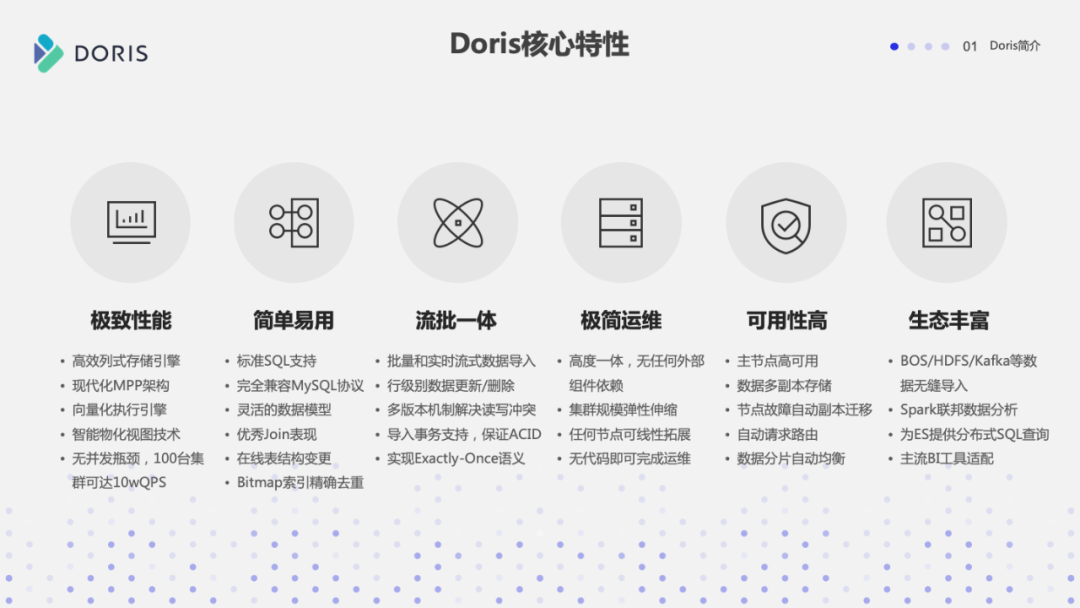 Doris 是一个 MPP 架构的分析型数据库,有几个特点:第一个特点,简单易用,支持标准 SQL 并且完全兼容 MySQL 协议,产品使用起来非常方便。