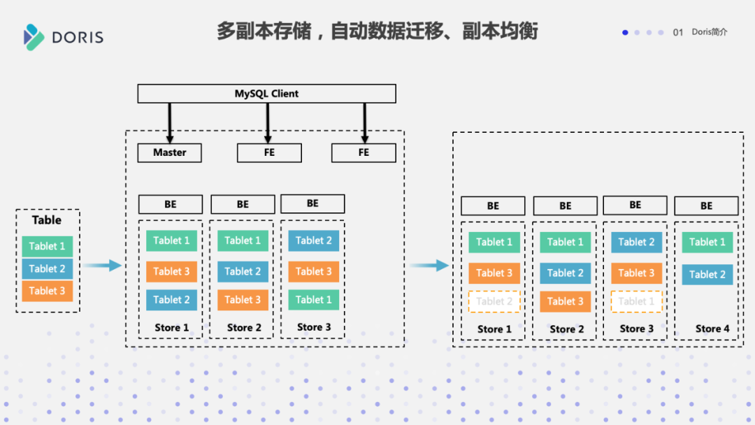 Doris 可以支持多副本的存储,而且数据能够自动迁移实现副本平衡。我们看到,Doris 中的数据是以 Tablet 的形式组织的,每一个表会拆分成多个 Tablet ,每个 Tablet 是由数据分区跟数据分桶来确定的。一旦确定了 Tablet 之后,在 Doris 当中所有的数据都是基于 Tablet 来调度,我们可以看到一个 tablet 可以分散在多个 BE 上做多副本的存储,如果有 BE 节点宕机,或者是有新的 BE 节点加入时,系统也会自动在后台执行数据副本的均衡。