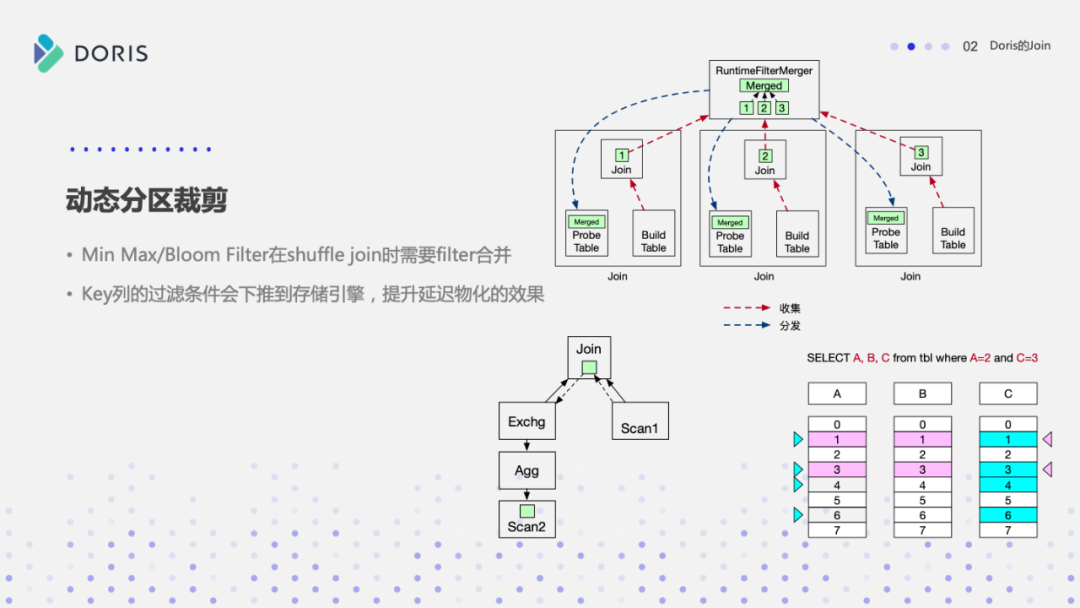 当 Join 列为左表的 Key 列时,RuntimeFilter 会下推到存储引擎。Doris 本身支持延迟物化,延迟物化简单来说是这样的:假如需要扫描 ABC 三列,在 A 列上有一个过滤条件: A 等于 2,要扫描 100 行的话,可以先把 A 列的 100 行扫描出来,再通过 A = 2 这个过滤条件过滤。之后通过过滤完成后的结果,再去读取 BC 列,这样就能极大的降低数据的读取 IO。所以说 Runtime Filter 如果在 Key 列上生成,同时利用 Doris 本身的延迟物化来进一步提升查询的性能。