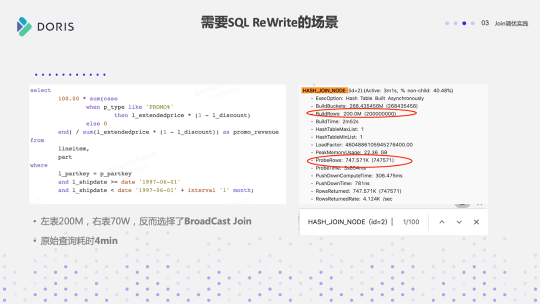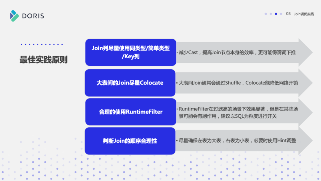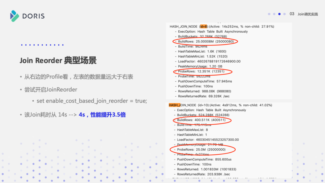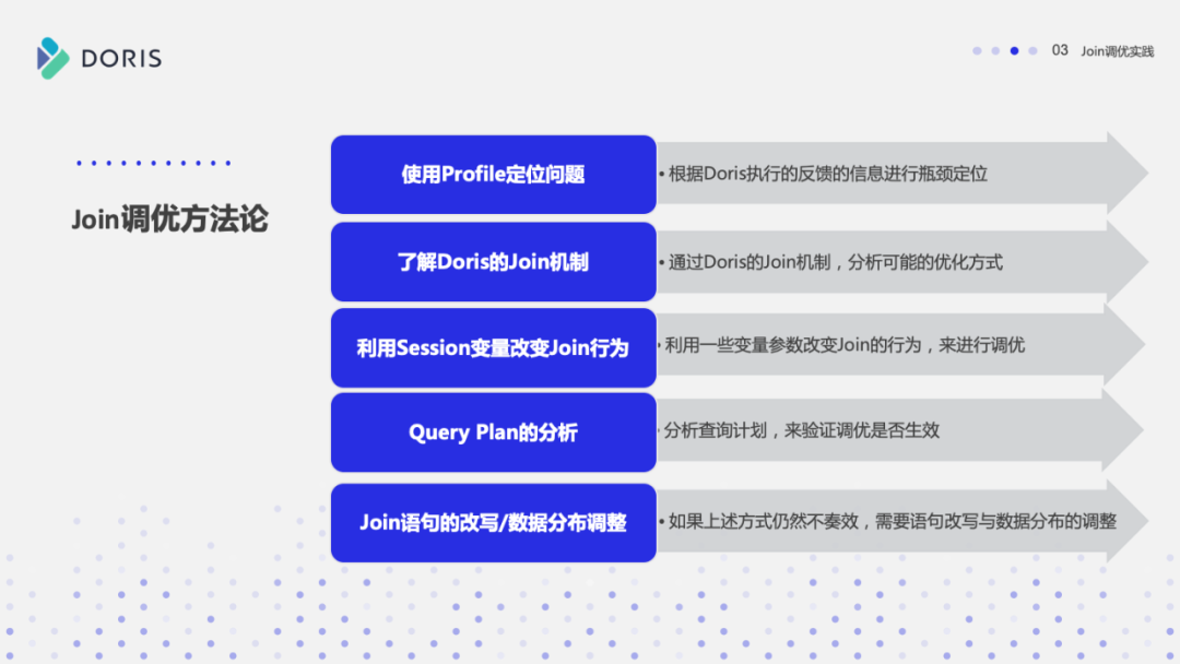 接下来就进入第三部分,Doris Join 的调优实践。第二部分分享了 Join 的机制之后,第三部分就需要利用 Doris 本身的一些 Join 特性,包括 Doris 提供的机制来做 Join 调优。