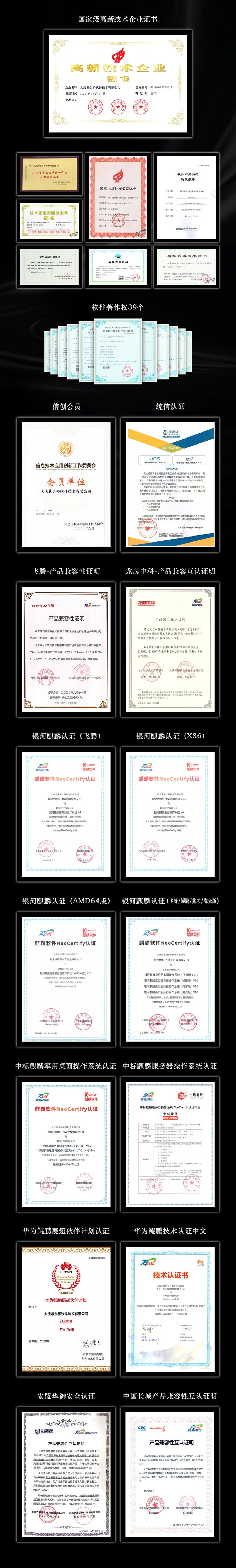 紫金桥软件获得了“双软”认证,并连续多年获得国家级高新技术企业、国家火炬计划项目认证、技术先进型服务企业、软件著作权等多项认证。截至目前“紫金桥跨平台实时数据库(版本V3.0及以上)”产品与国产操作系统和国产处理器的相互认证已达18项,更多的认证正在进行当中。