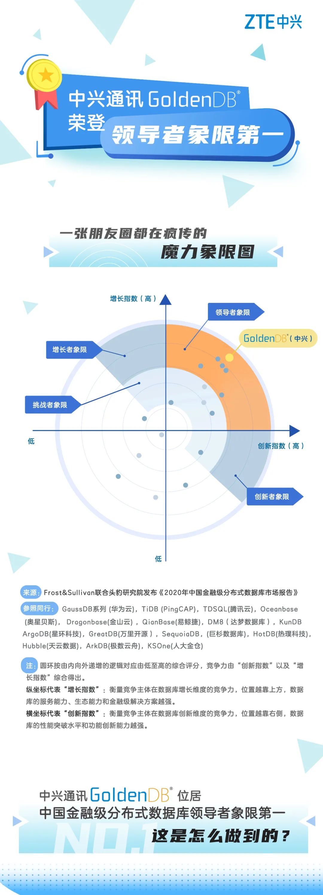 8月30日,Frost&Sullivan联合头豹研究院正式发布《2020年中国金融级分布式数据库市场报告》,中兴通讯GoldenDB位居中国金融级分布式数据库领导者象限第一位置,在增长指数及创新指数方面全面领先同行,成为国产分布式数据库金融行业第一品牌。