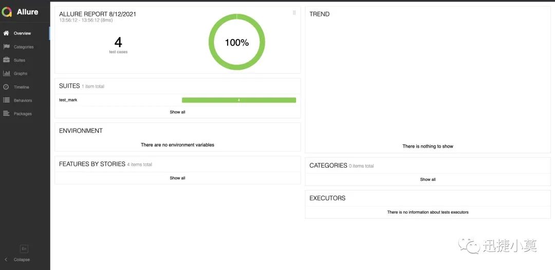 allure的功能还有很多很多,比如它支持一些截图,支持一些装饰器的使用,可以对我们用例的步骤进行拆分,还可以给用例打标记之类的功能,我们就不放在本篇介绍了,就留给大家自行学习,小提莫在这里抛砖引玉一下了。