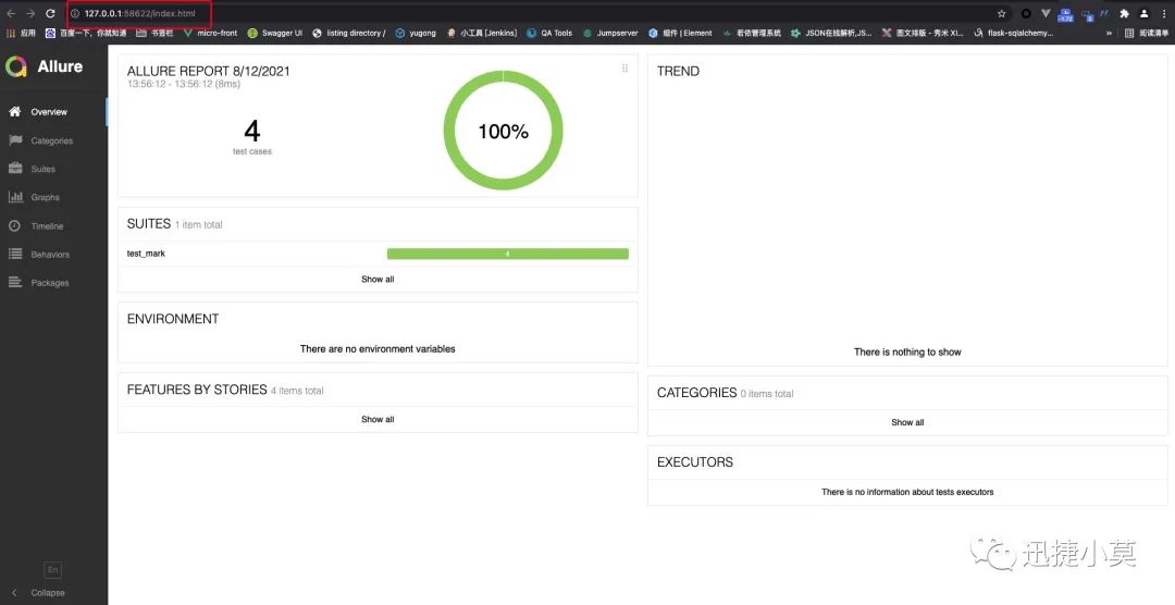 (venv) zhangyingkai@kaikaideMacBook-Pro f_pytest % allure serve ./allure-resultsGenerating report to temp directory...Report successfully generated to var/folders/jg/jbnxsfzx3gv_5vbyfmc1lq5w0000gn/T/6115195889032489317/allure-reportStarting web server...2021-08-12 15:14:58.083:INFO::main: Logging initialized @2859ms to org.eclipse.jetty.util.log.StdErrLogServer started at <http://127.0.0.1:58622/>. Press <Ctrl+C> to exit