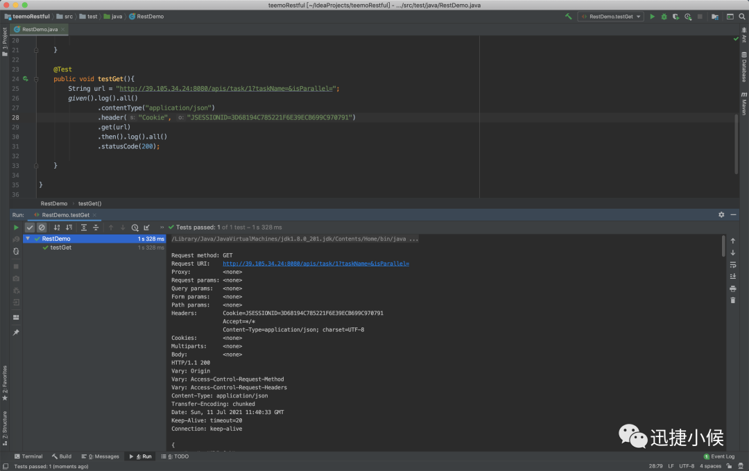 import common.TeemoConfig;import org.testng.annotations.Test;import static io.restassured.RestAssured.*;public class RestDemo {@Testpublic void testLogin(){//接口urlString url = "http://39.105.34.24:8080/apis/login";//接口请求体String body = "{\"userName\":\"admin\",\"password\":\"123456\"}";given().log().all().contentType("application/json").body(body).post(url).then().log().all().statusCode(200);}@Testpublic void testGet(){String url = "http://39.105.34.24:8080/apis/task/1?taskName=&isParallel=";given().log().all().contentType("application/json").header("Cookie", "JSESSIONID=3D68194C785221F6E39ECB699C970791").get(url).then().log().all().statusCode(200);}/*** 使用封装好的cookie发送请求*/@Testpublic void testGetOne(){String url = "http://39.105.34.24:8080/apis/task/1?taskName=&isParallel=";given().log().all().contentType("application/json").header("Cookie", TeemoConfig.getCookie()).get(url).then().log().all().statusCode(200);}}