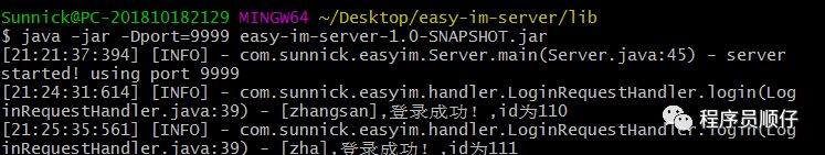执行mvn package后生成easy-im-server.tar.gz,解压后至./lib目录执行命令: java -jar -Dport=8888 easy-im-server-1.0-SNAPSHOT.jar,即可启动服务端,其中port是服务端口。