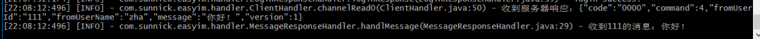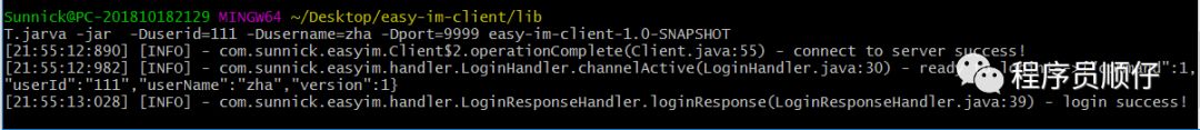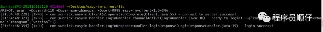 执行mvn package后生成easy-im-client.tar.gz,解压后至./lib目录执行命令: java -jar -Duserid=110 -Dusername=zhangsan -Dhost=127.0.0.1 -Dport=8888 easy-im-client-1.0-SNAPSHOT.jar。 其中userid为用户id,username为用户名,host为服务端ip,port为服务端端口,其中userid要保持唯一性。