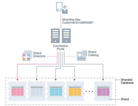 为了实现 sharding,Oracle 在连接池和驱动方面都做了增强,提供了新的 API(UCP, JDBC, OCI 等等)在连接创建时来传递 sharding keys。