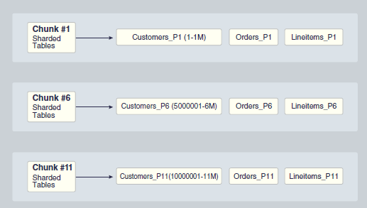 如 customers 表中的1号~100万号客户信息在一个分区中;在 order 表中,也有1号~100万号的客户的 order 信息,也在一个分区中;另外 LineItems 表中的1号~100万号客户的明细信息,也在一个分区中,我们希望这些相关的分区,都是在一个 shard node 中,避免 cross shard join。所以,我们把这些在同一个 table family 内,相关的分区叫做 chunk。在进行 re-sharding 的时候,是以 chunk 为单位进行移动。因此可以避免 cross shard join。