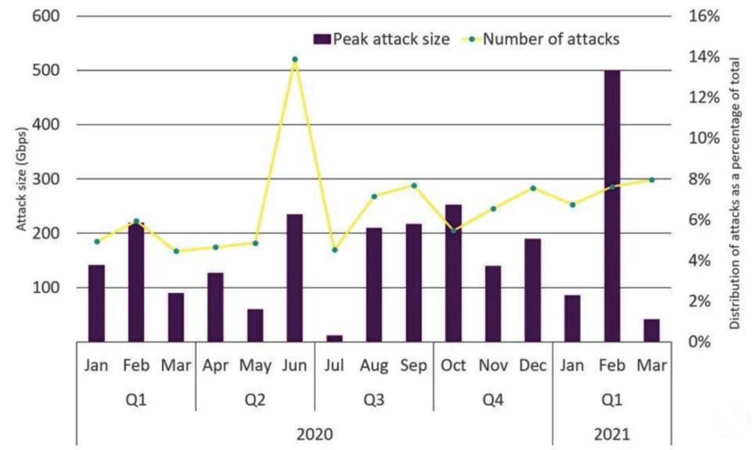为了榨取更多的比特币赎金,RDDoS 勒索攻击者在攻击规模、频率和目标多样化方面不断提高标准。2021 年一季度检测到已知最大的勒索 DDoS 攻击,峰值带宽达到 800Gbps ,目标是一家欧洲赌博公司。