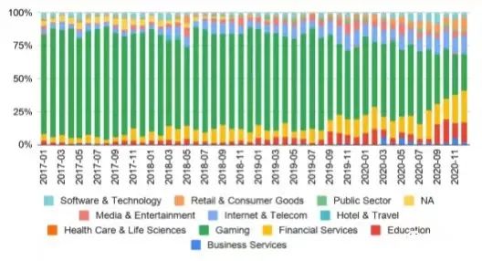 可以看到 DDoS 攻击者一直在跨地域和跨行业方面进行多样化尝试。四年前,大多数 DDoS 攻击目标是游戏公司。如今,零售商、电信、ISP 服务商、金融企业和教育组织都成为了 DDoS 攻击的目标。从下面这张分析图表中,我们可以看到中间绿色的游戏行业被攻击占比,已逐渐与其他行业拉平。