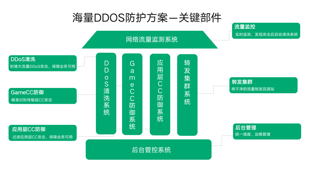 另外,清洗系统具有高稳定性优势,单台清洗设备能力接近 2TB 。采用运营商级别硬件设备,运行更加稳定,单清洗机房节点提供相当于 70 台物理服务器集群的清洗能力。