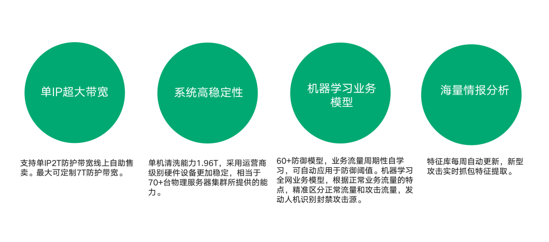 第二,防护能力强。全国 7 个以上清洗节点,攻击流量就近引入清洗节点,整体时延小于 50 毫秒。总体防护带宽 4T,单线最大防护带宽高达 2TB。从 4 到 7 层全流量 DDoS 攻击防御,支持多种应用 CC 攻击防护。