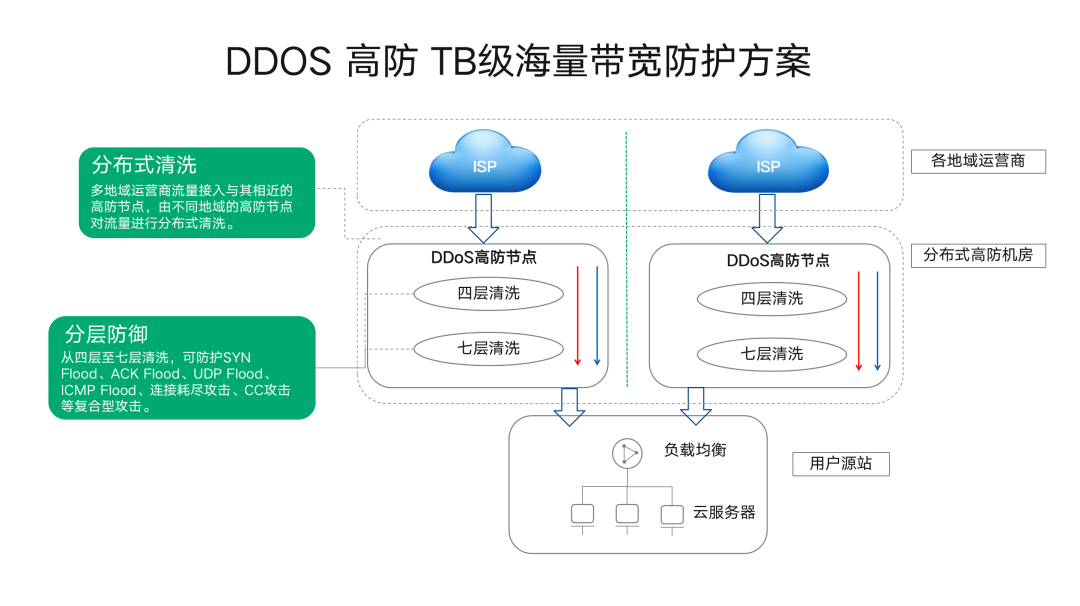 并且,高防 IP 服务内部为用户提供云平台负载均衡能力,来接受经过清洗之后干净的回源流量,并转发给源站。最大化减少对源站的流量压力。