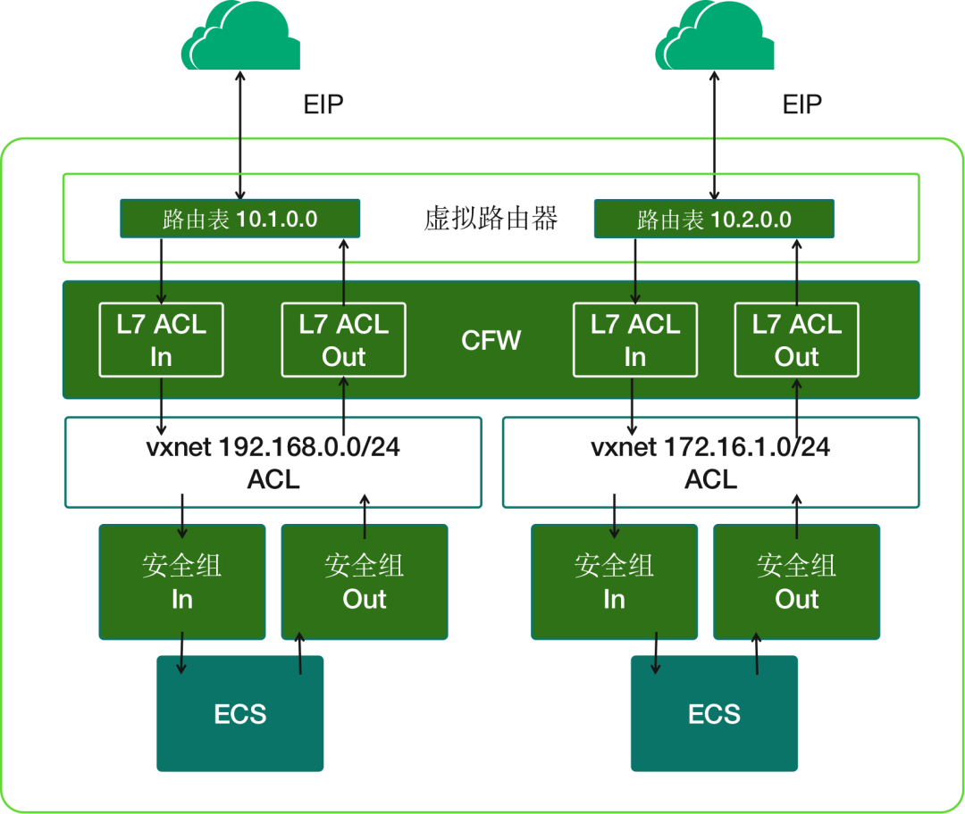 通过云防火墙拦截规则后,流量将通过私有网络的 ACL 规则。在这里用户可以设置不同网络之间的访问规则,仅允许必须的网络间互访。