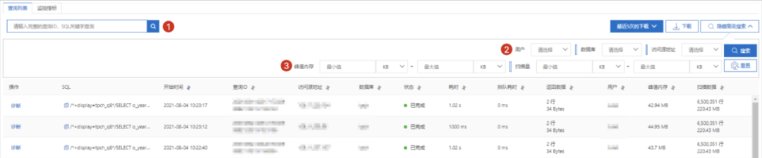 同时,用户在使用诊断工具时,往往有对慢查询的下载需求,下载后的慢查询可以在例如Excel等工具中进行更多自定义的慢查询治理和分析,所以我们也提供了查询列表的下载功能。