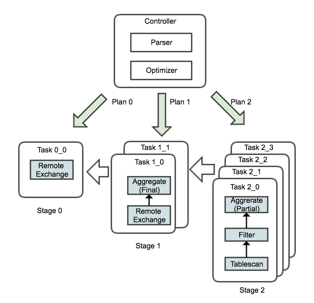 在ADB内部,首先由前端的Controller节点接收SQL语句请求,并对SQL语句进行语句解析和语法分析(Parser),最后使用优化器(Optimizer)生成最终的执行计划,整体执行计划会根据Stage的划分原则被切分为子计划,如图中的Plan0、Plan1和Plan2,分别被下发到对应的节点上。