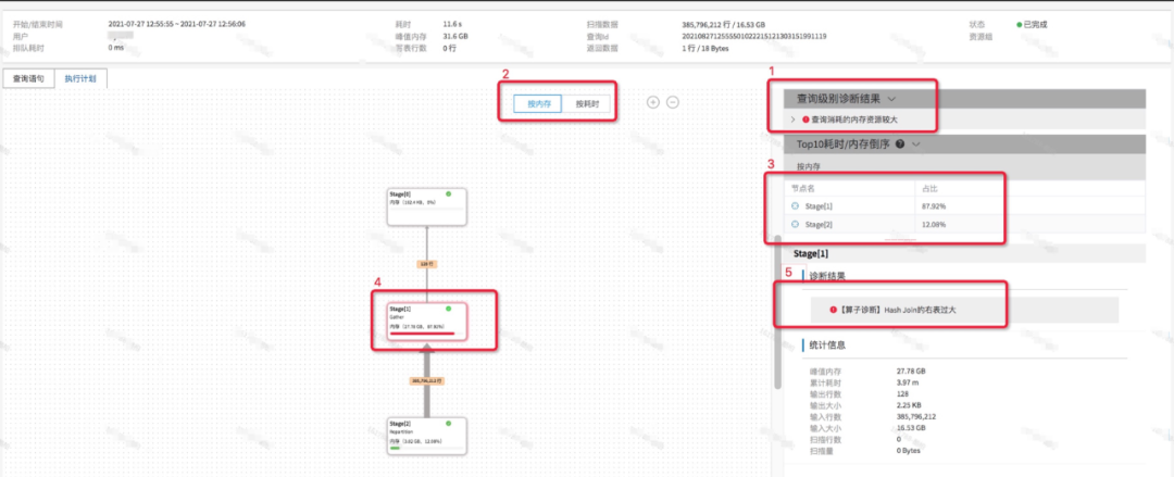 以上的例子通过「查询级别诊断结果」和「算子级别诊断结果」进行SQL性能问题定位的方法,我们再来看一个「Stage级别诊断结果」的例子。