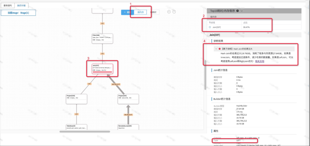 点击「查看Stage执行计划」,进入到Stage[1]内部,首先,我们依然根据内存排序,可以看到,其中的Join[317]这个算子占用了整个Stage 99%以上的内存,点击该算子,算子执行计划树自动定位到当前算子,这时我们就可以看到算子诊断结果的详细信息了,信息提示我们,在构建Hash表用户Left Join时,占用了较大的内存,诊断结果还提供了官方的调优文档链接,根据文档中给出的调优方法,我们就可以减少该算子的内存占用。