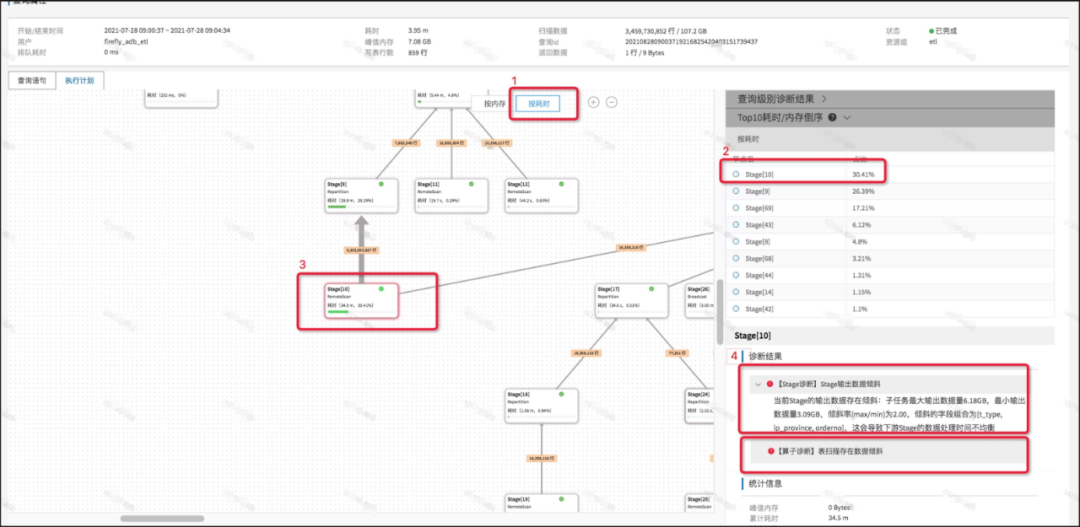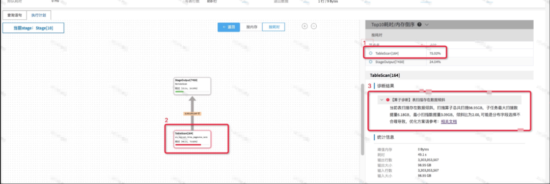 如下图所示,我们可以看到根据耗时排序后,Stage[10]的耗时比例最大,点击执行计划图中的Stage[10],可以在诊断结果栏看到两类诊断结果,一类是“Stage诊断”,一类是“算子诊断”,其中的Stage诊断告诉我们当前Stage的输出数据有倾斜,并且告诉我们倾斜的字段是哪些(数据倾斜是分布式系统中严重影响性能的问题,Stage输出数据倾斜不但会当时当前Stage处理数据在时间上存在长尾,而且会导致下游的数据处理存在长尾),同时可以看到有一个算子诊断结果,提示我们表扫描存在倾斜,那么我们可以初步判断当前Stage输出数据倾斜是因为扫描了一个数据倾斜的表导致的。接下来我们进入到Stage[0]内部进行定位和分析。