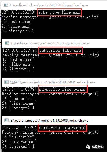 四个订阅者,两个订阅like-man,两个订阅like-woman。