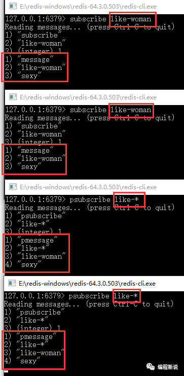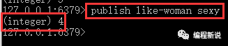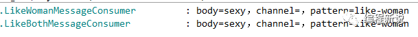 有四个订阅者接收到该消息,分别是两个订阅like-woman的和两个订阅like-*的。