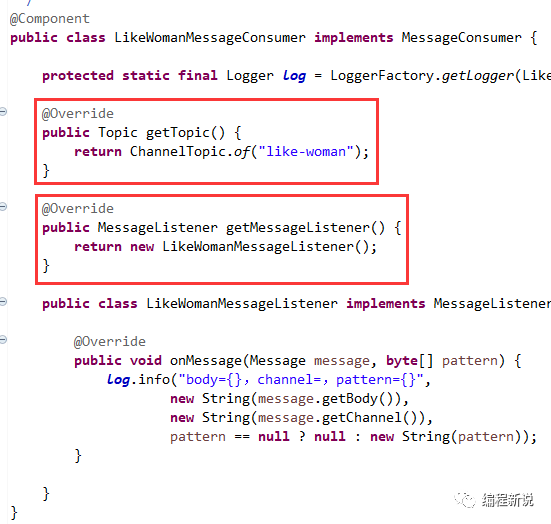 明白了原理后,就会变得很简单。我们只需成对的提供Topic和MessageListener即可,Topic告诉Spring要接收什么消息,MessageListener告诉Spring如何消费这些消息。