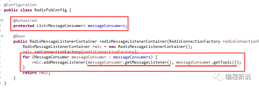 最后需要注册核心类(RedisMessageListenerContainer)为Bean,然后再收集到所有注册的消费者(MessageConsumer)Bean,并把它们添加到核心类里面即可。