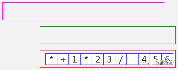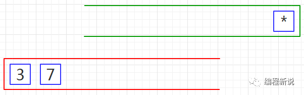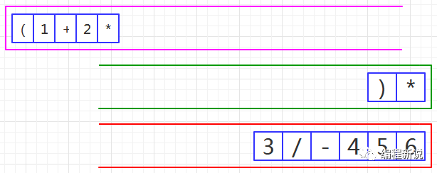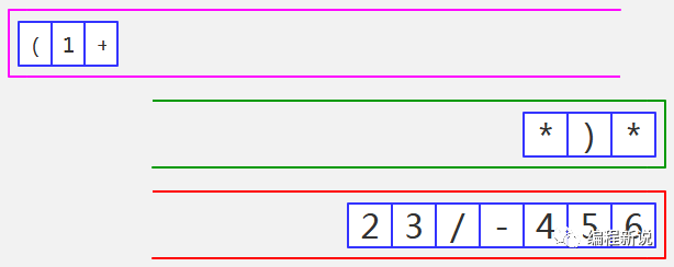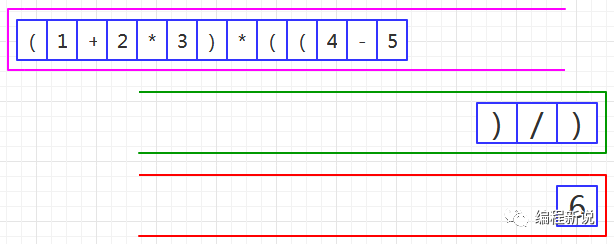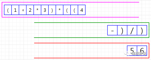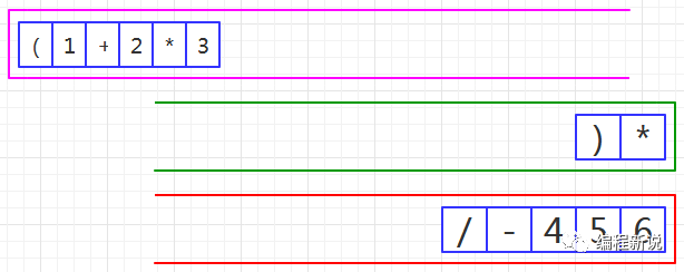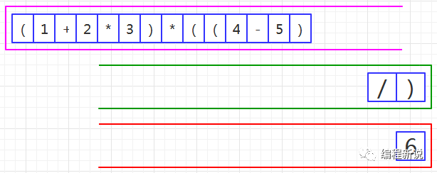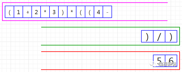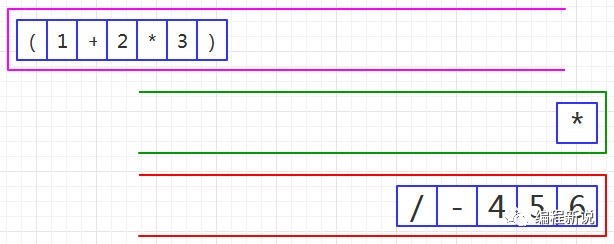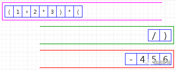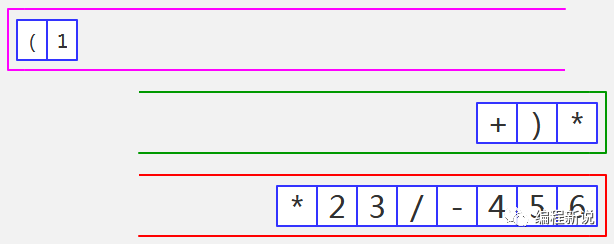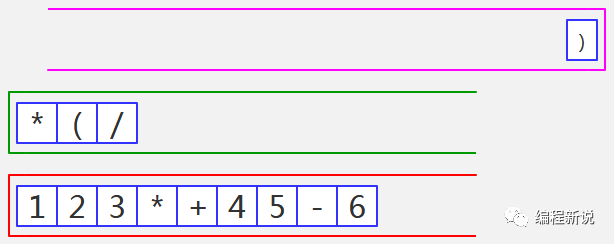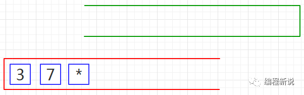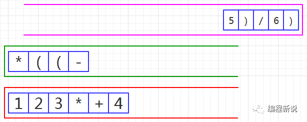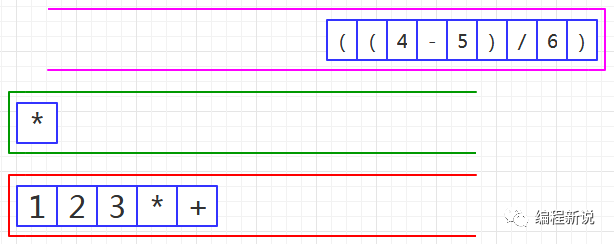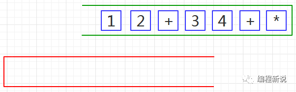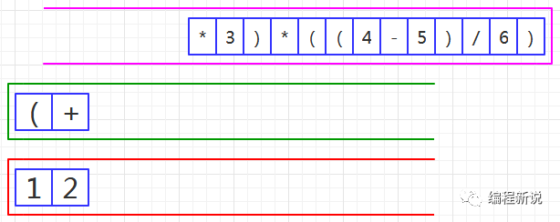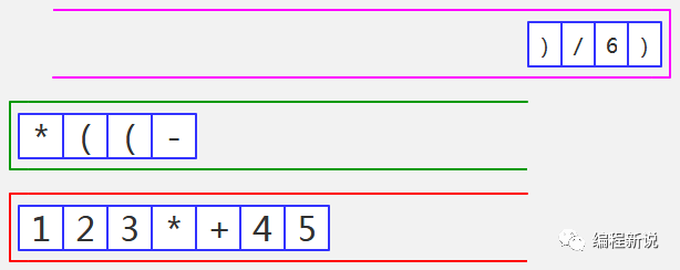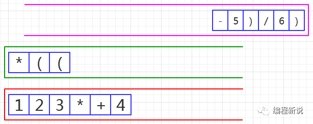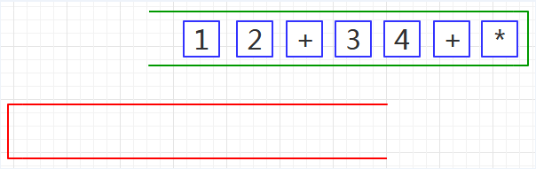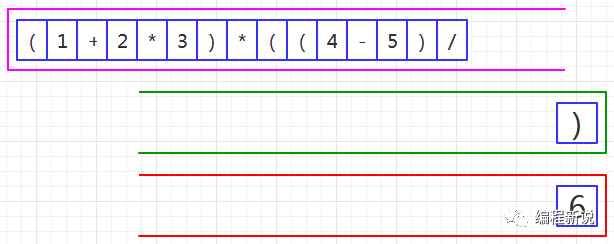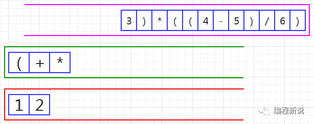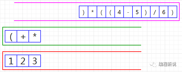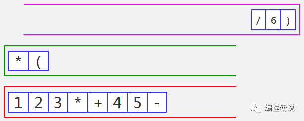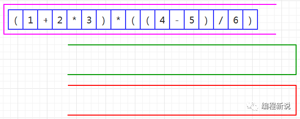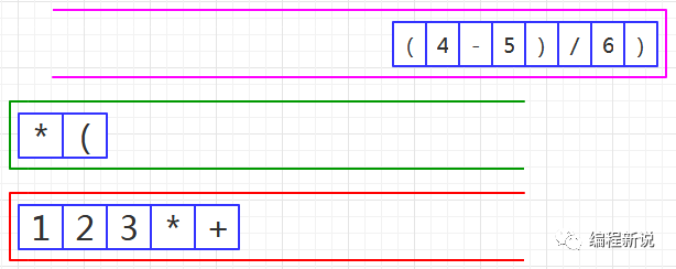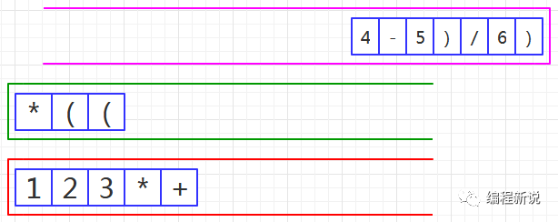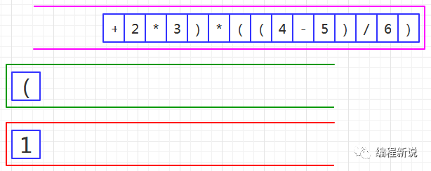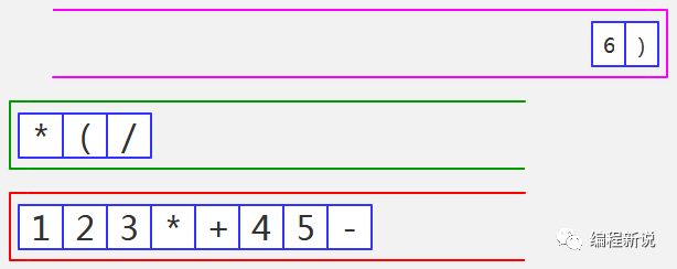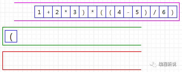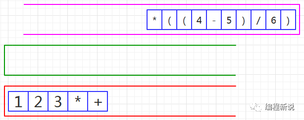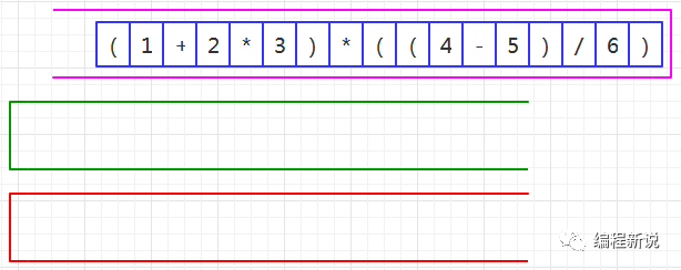 表达式的计算要用到栈,所以先准备两个栈,一个用红色标记,一个用绿色标记。