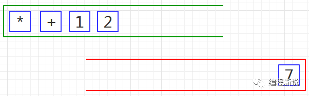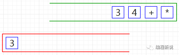 第三步、将红栈中的运算符及其后的两个操作数弹出,计算出结果后并再次压入红栈,如下图03: