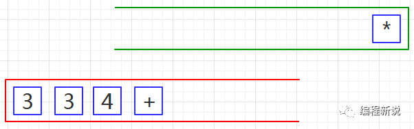 第三步、将红栈中的运算符及其后的两个操作数弹出,计算出结果后并再次压入红栈,如下图10: