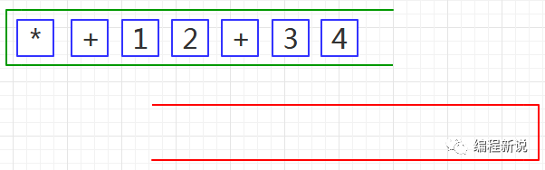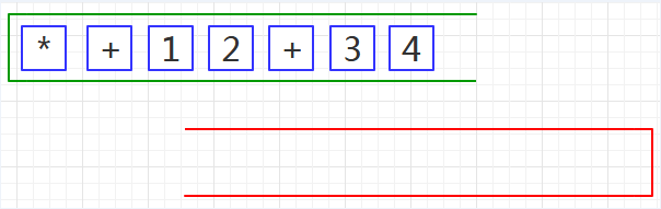 第一步、把前缀表达式装入绿栈,使表达式的尾部位于栈顶,如下图08:
