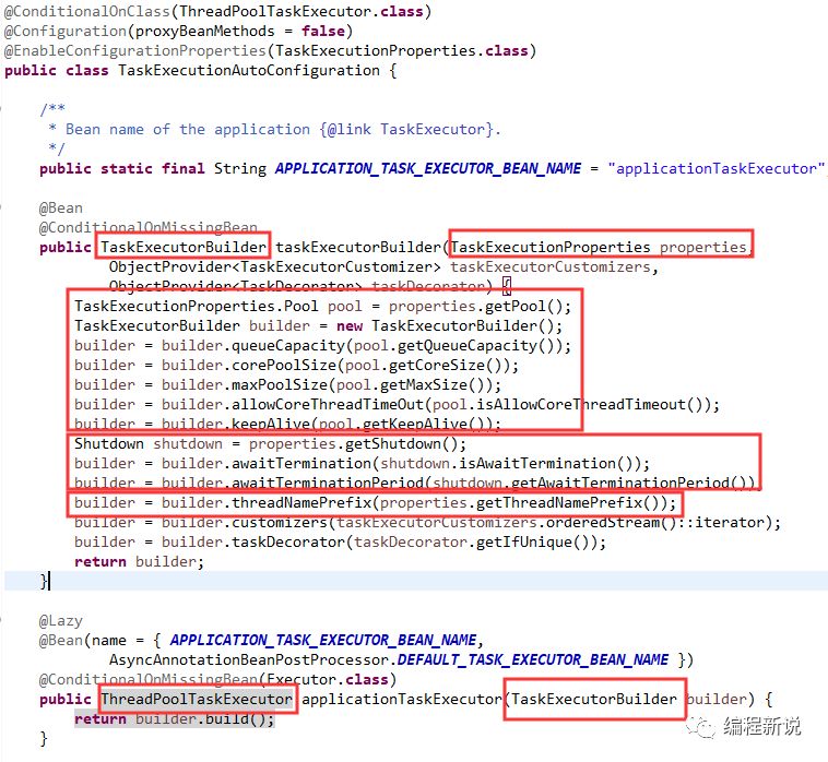 首先使用刚刚的属性注册一个TaskExecutorBuilder类型的bean,然后再使用它注册一个ThreadPoolTaskExecutor类型的bean。