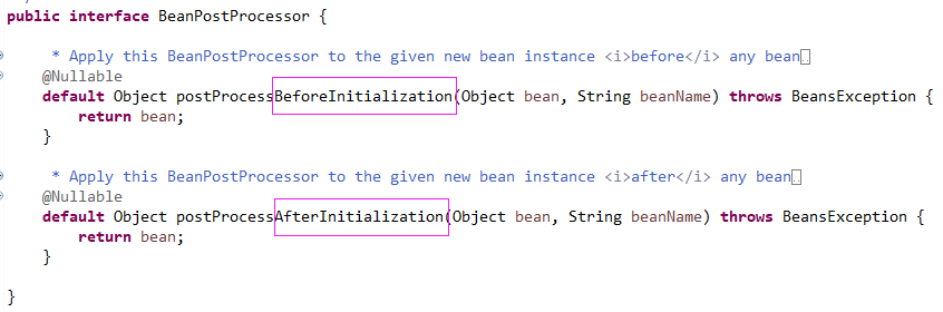 第二个方法在bean实例化后且属性设置(显式的属性设置或依赖的装配)前调用。