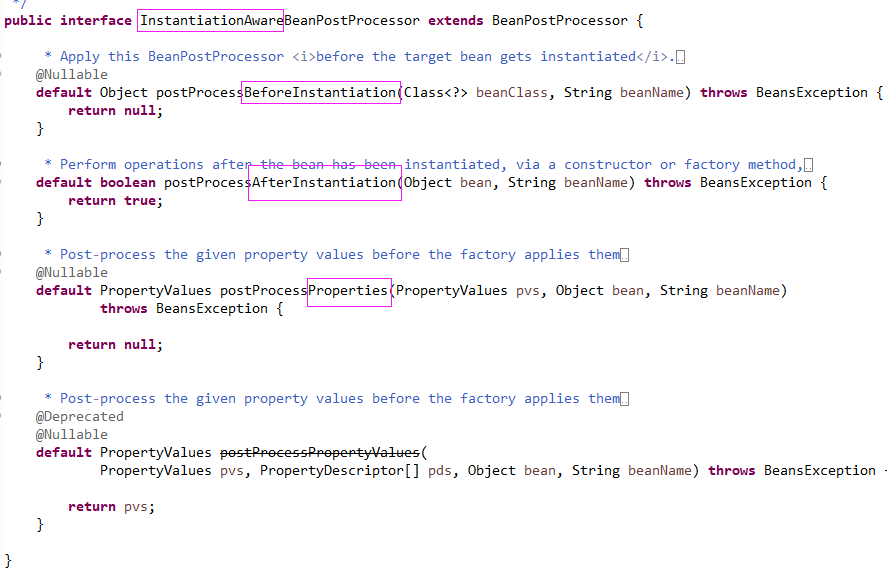 接口的名字中有InstantiationAware,说明是“实例化感知”的bean后处理器。即可以参与到bean的实例化过程中。确实比上一个接口提前了。
