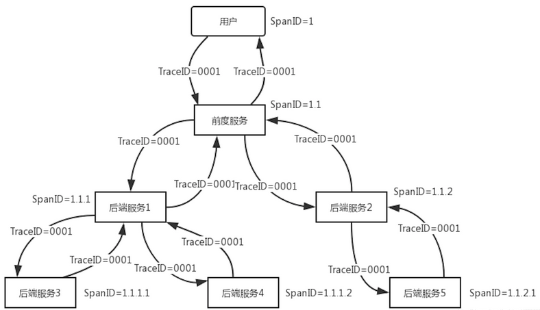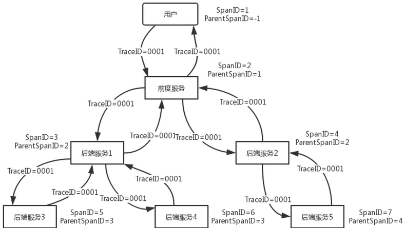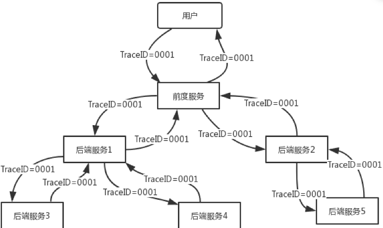 前端接收用户请求后会为用户分配一个TraceID,在内部服务调用时,会通过应用层的协议将TraceID传递到下层服务,直到整个调用链的每个节点都拥有TraceID,这样在系统出现问题时,可以使用这个唯一TraceID迅速问题发生的节点。