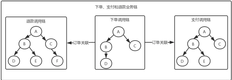 我们需要在多次请求之间建立联系,可以通过业务的业务ID(如:订单ID)来串联业务链,如果调用链是一个简单的树形结构,而业务链就是一个森林结构: