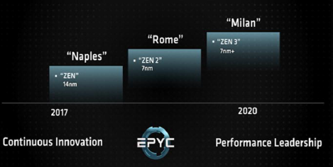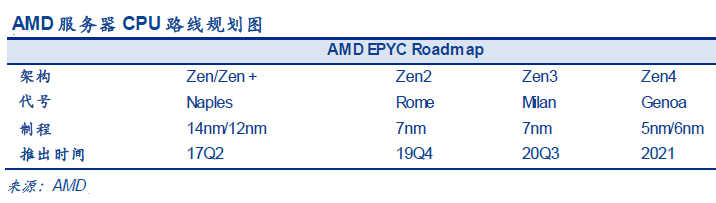 AMD基于 Zen 2 架构的服务器 CPU Rome 型号于 2019 年 Q4 上市,基于 Zen4 架构的Genoa 预计将采用 5nm 工艺并于 2021 年上市