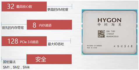 海光基于Zen架构的Dhyana处理器(禅定),最多支持32核,PCIe3.0总线,主频2.0GHz,基于14nm工艺;Hygon处理器,双路处理器,支持SM2、SM3和SM4安全算法。