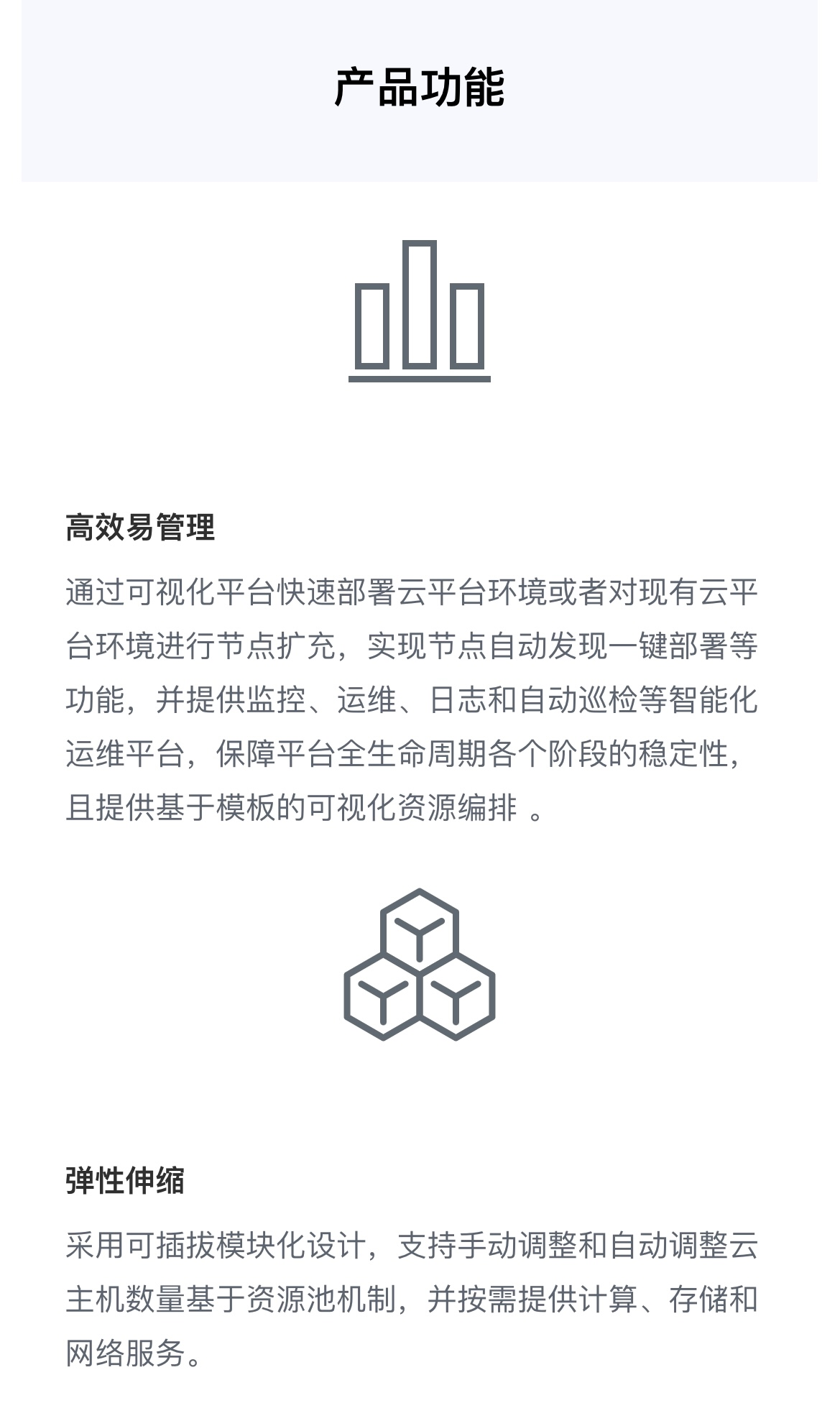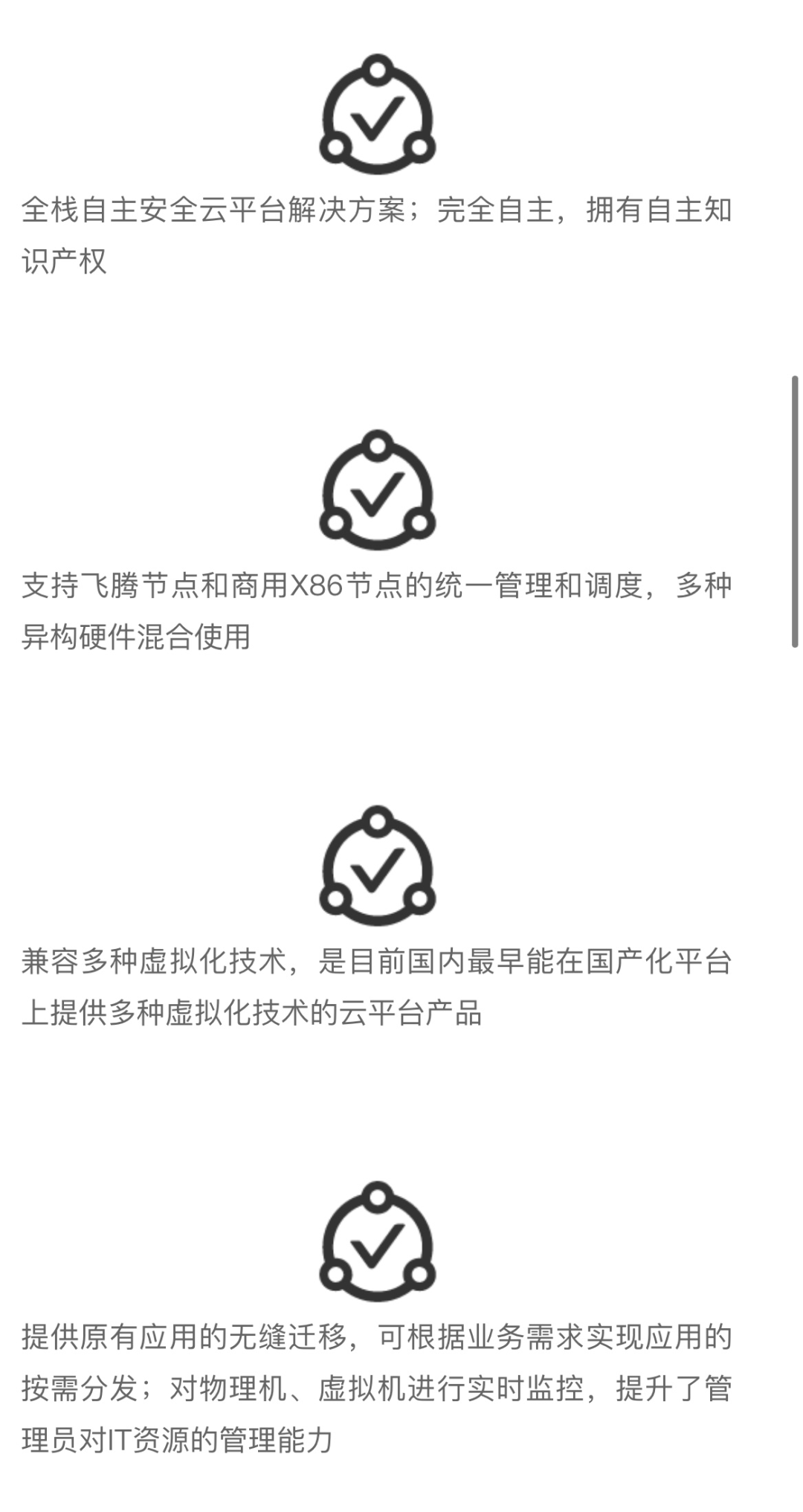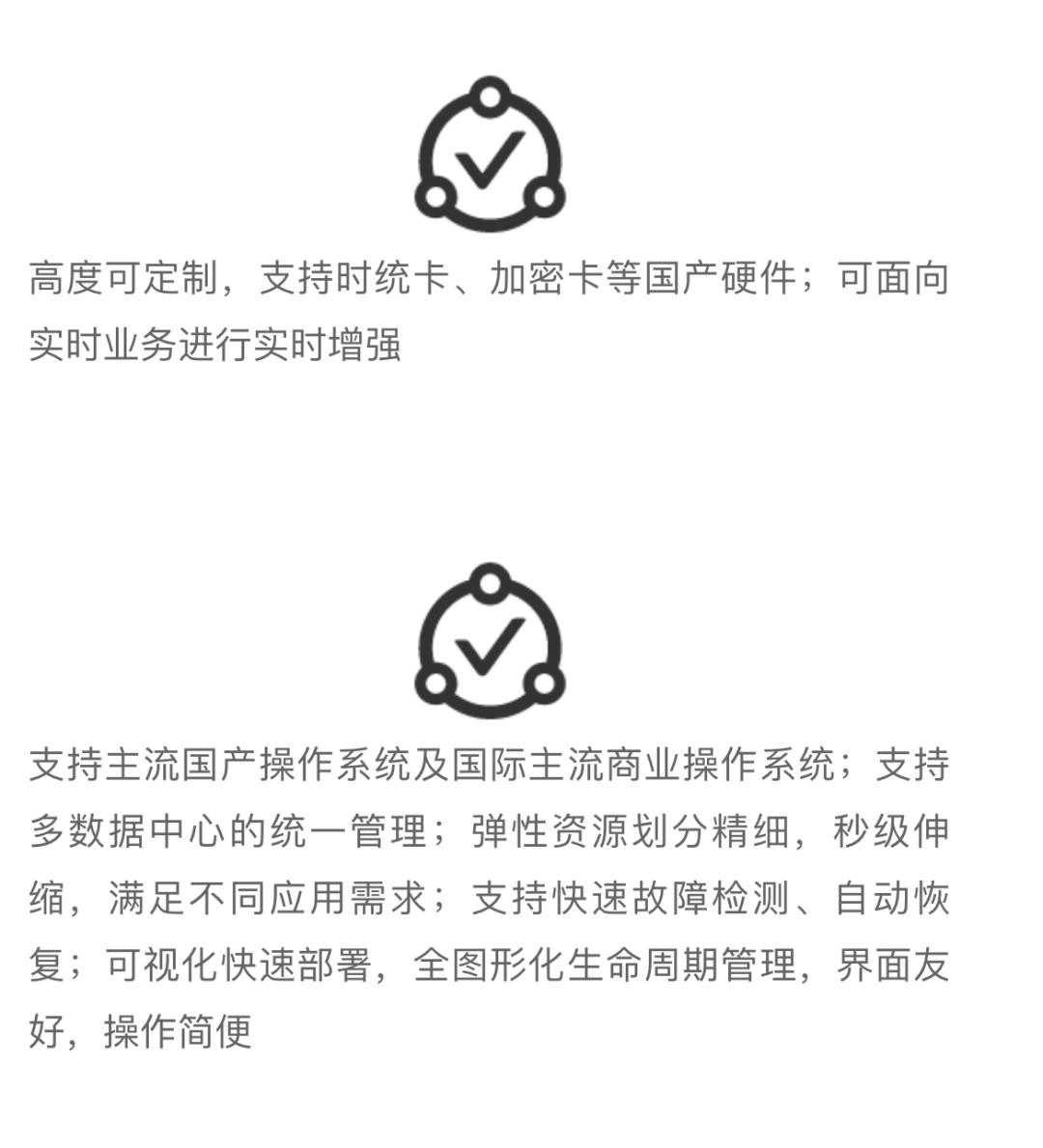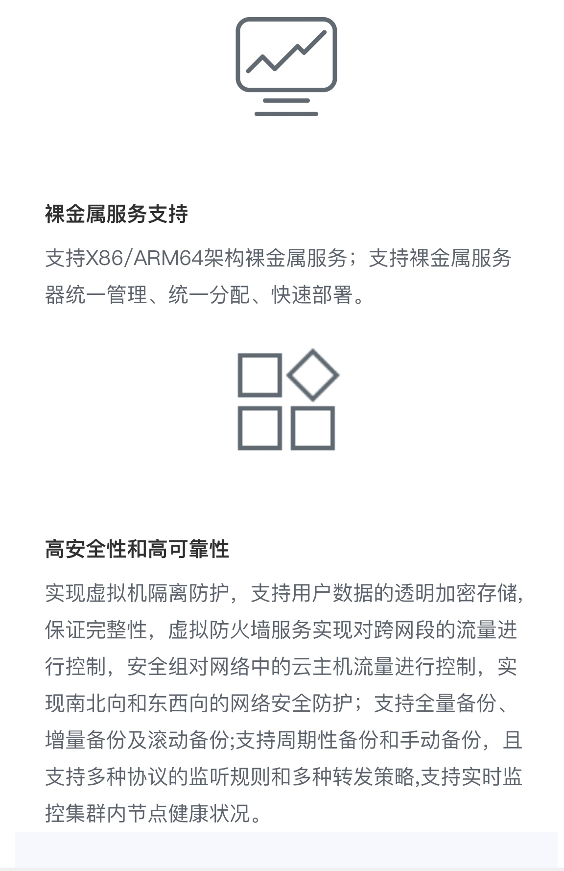 银河麒麟云平台是支持全栈自主的云平台解决方案。平台完美支持飞腾1500A和飞腾2000系列国产CPU,支持KVM、Docker、LXC等主流虚拟化方式,支持重栈虚拟机、容器、物理机等资源的统一编排和调度,支持主流容器编排引擎。依托银河麒麟高级服务器操作系统,银河麒麟云平台以Web服务的方式将IT基础设施资源按需提供给用户使用(IaaS服务)。同时平台采用模块化、可插拔的设计理念与资源池机制,向用户提供按需使用、易于管理、动态高效、灵活扩展、稳定可靠的服务,致力于为用户提供安全、弹性、高可用、高性能的公有云/私有云/专业云解决方案。