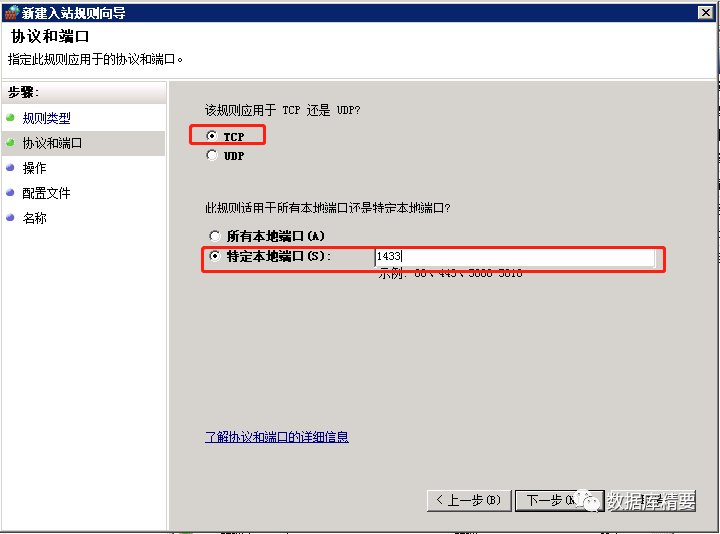 第五步:选择TCP,然后特定本地端口,输入sqlserver的访问端口1433.