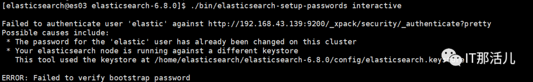 设置密码在集群中任意一个elasticsearch节点执行完成即可,如果执行第二次,将会给出如下错误提示:
