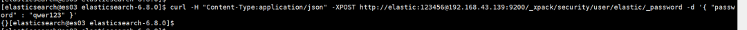 curl -H "Content-Type:application/json" -XPOST http://elastic:123456@192.168.43.139:9200/_xpack/security/user/elastic/_password -d '{ "password" : "qwer123" }'
