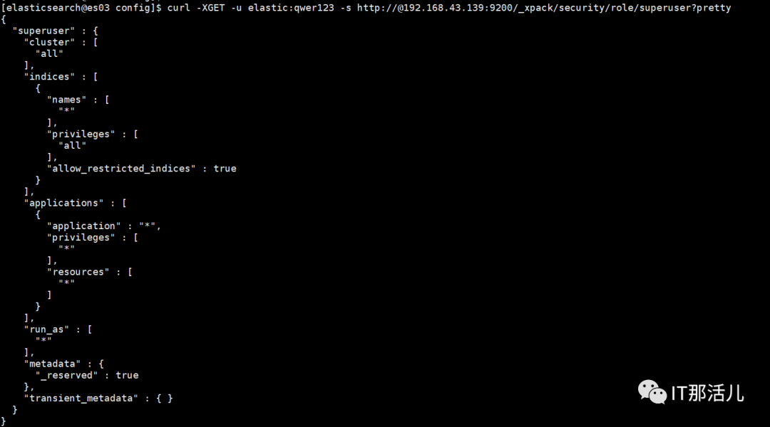 curl -XGET -u elastic:qwer123 -s http://@192.168.43.139:9200/_xpack/security/role/superuser?pretty