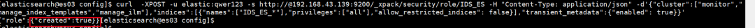curl -XPOST -u elastic:qwer123 -s http://@192.168.43.139:9200/_xpack/security/role/IDS_ES -H "Content-Type: application/json" -d'{"cluster":["monitor","manage_index_templates","manage_ilm"],"indices":[{"names":["IDS_ES_*"],"privileges":["all"],"allow_restricted_indices": false}],"transient_metadata":{"enabled": true}}'