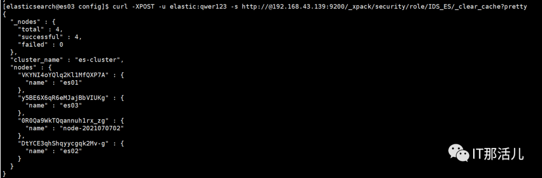 curl -XPOST -u elastic:qwer123 -s http://@192.168.43.139:9200/_xpack/security/role/IDS_ES/_clear_cache?pretty